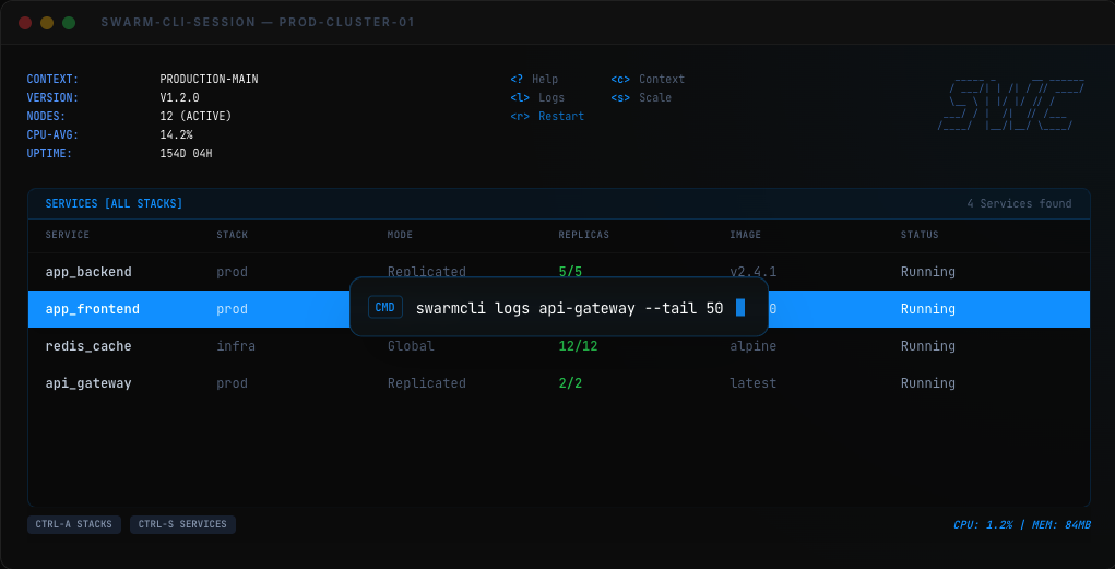 Efficiency is at the core of SwarmCLI. Written in Go, it is distributed as a single static binary, making it incredibly easy to install and run on any machine—from your local workstation to a bastion host. Its design is inspired by popular tools like k9s, but tailored specifically for the unique architecture of Docker Swarm. Whether you're managing a single-node setup or a sprawling multi-region cluster, SwarmCLI scales with your needs without adding overhead.